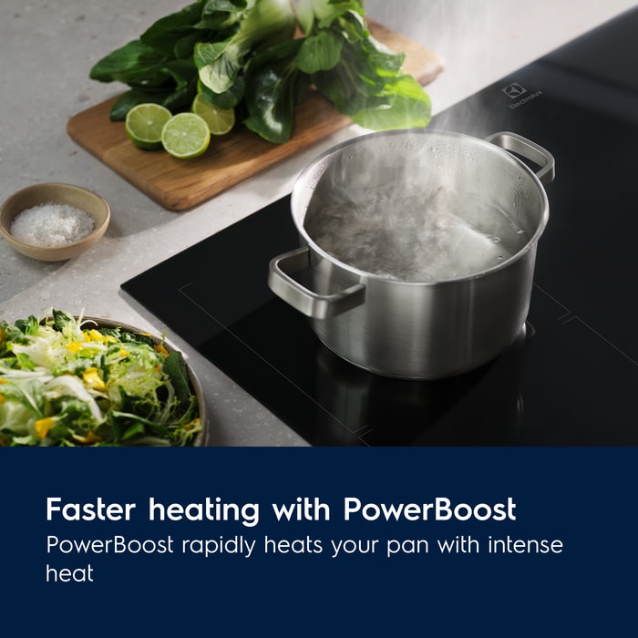 The 500 Fast & Powerful induction hob with Powerboost heats twice as fast as a radiant hob. Efficiently, with immediate temperature response.