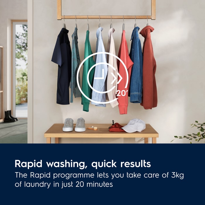 1. The Rapid programme lets you quick-wash your clothes for light cleaning. Take care of 3kg of laundry in just 20 minutes.